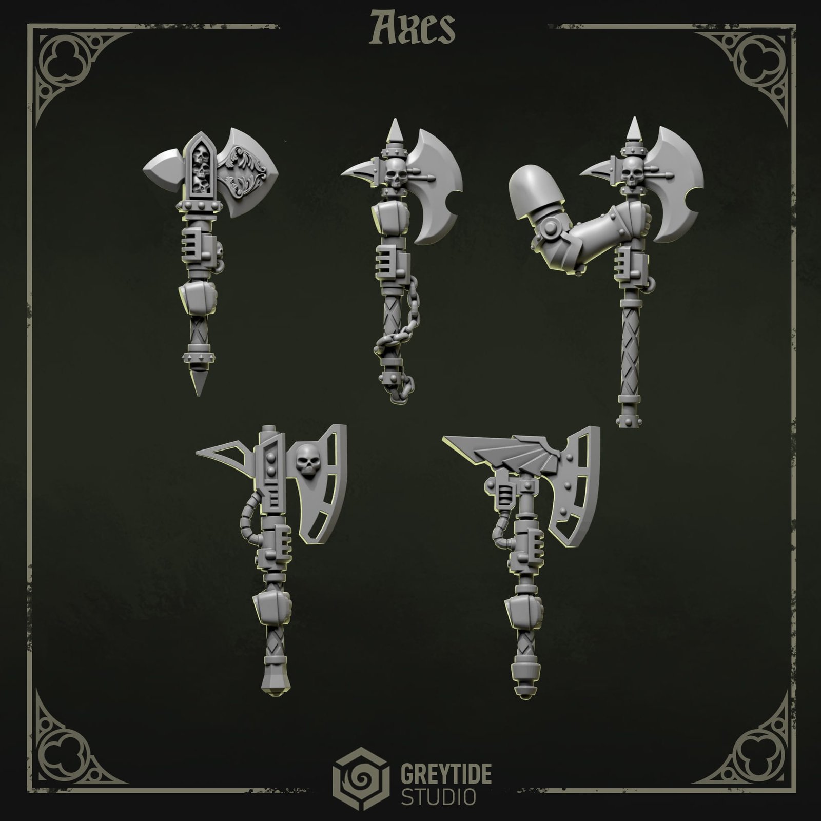 Diseño de Greytide Studio, impresos en resina 3D de alta calidad, ideales para conversiones, personalización y proyectos de pintura.